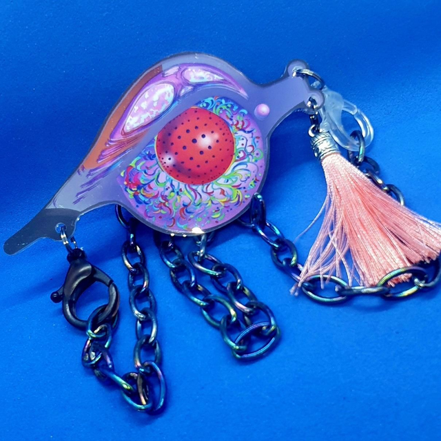 A 100mm long brooch, complete with a salmon pink tassel and 50cm acrylic chain to wear the brooch as a pendant. The brooch can be dressed up or down as the elements are affixed with clasps.