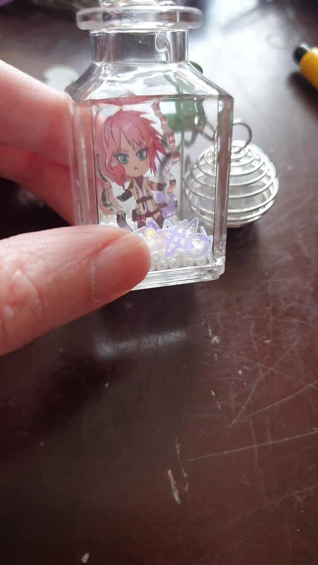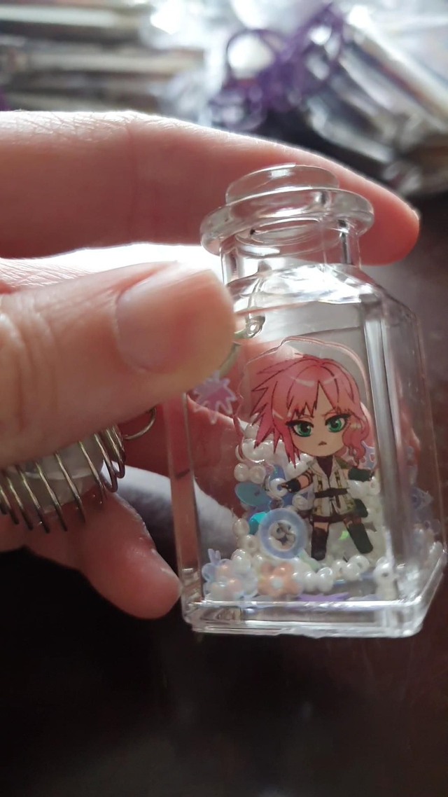 4cm tall, 3d bottle shaped keychain. Comes with a little touchlight!